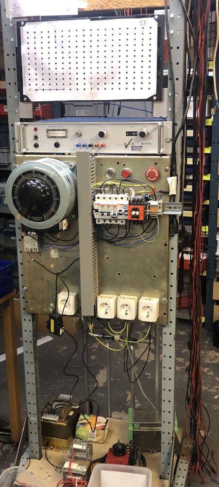 För tester i förrådet finns detta flyttbara rack för olika spänningar som kan behövas på plats innan de tas till verkstaden.